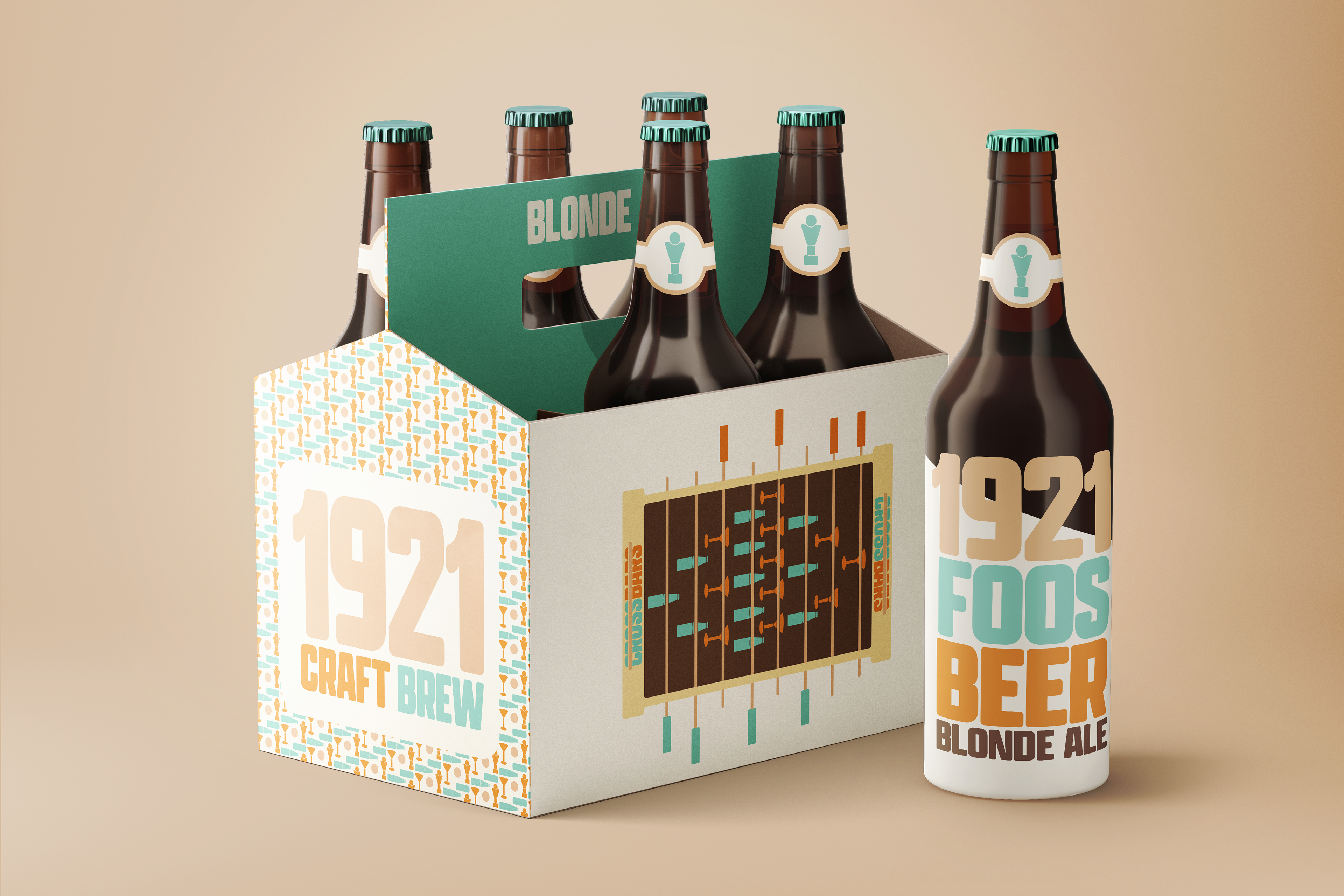 My roommate and I love playing foosball - so much so that we bought a foosball table that now stands proudly in our kitchen. One day we had the classic "we should start a bar" conversation. But our bar would revolve around the great sport of foosball. Taking a modern twist on the classic billiards bar, Crossbars is a fictional brewery and bar where foosball and booze meet in a brand new way. Crossbar's own craft brew, the 1921, comes in three varieties: blonde ale, stout, and IPA.
