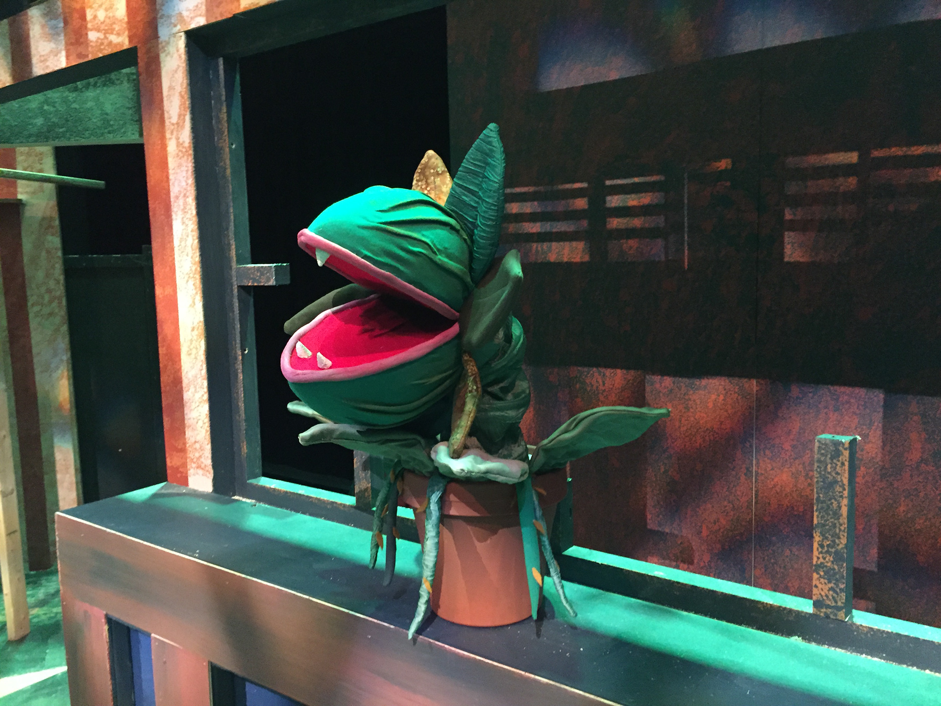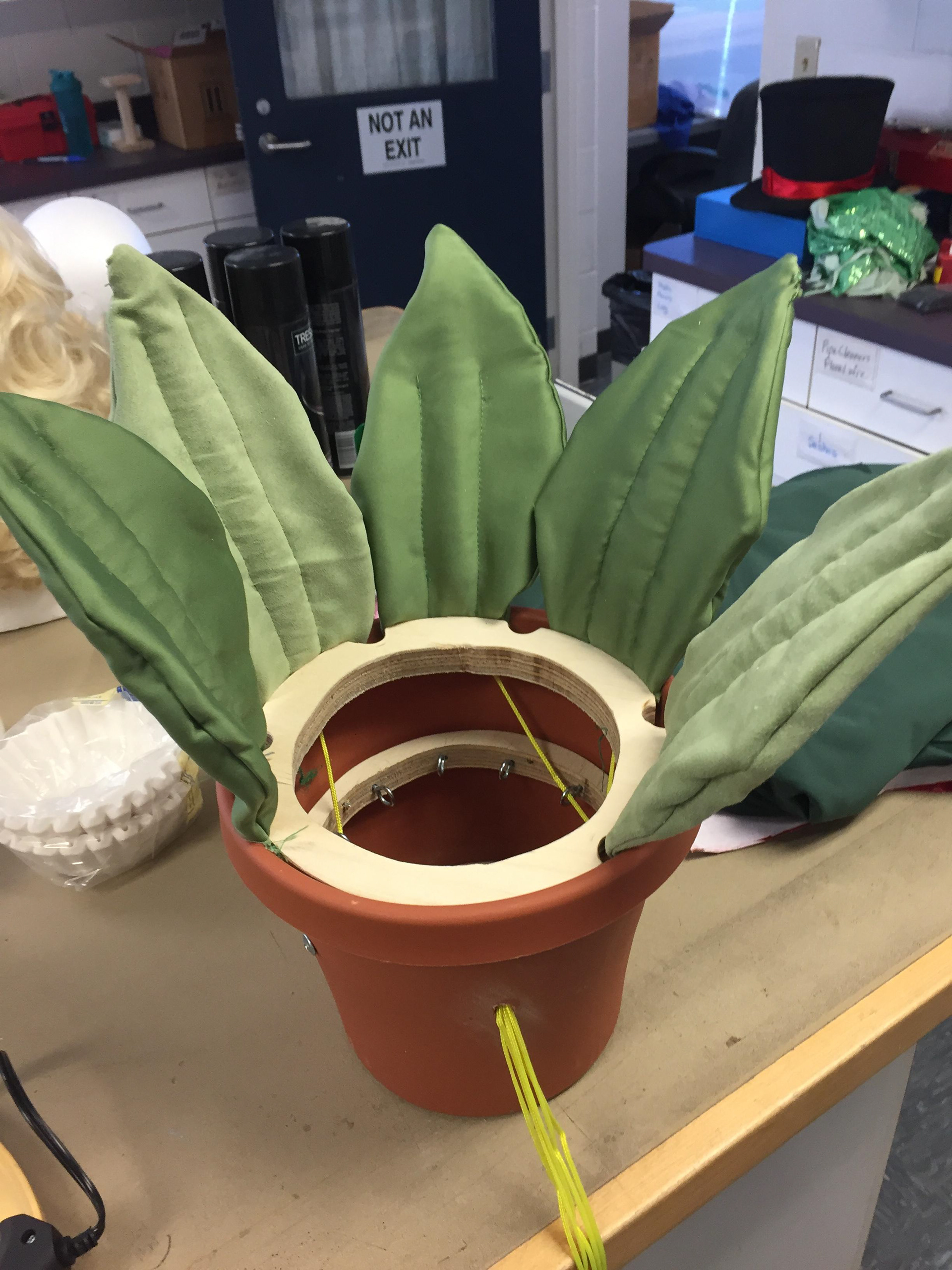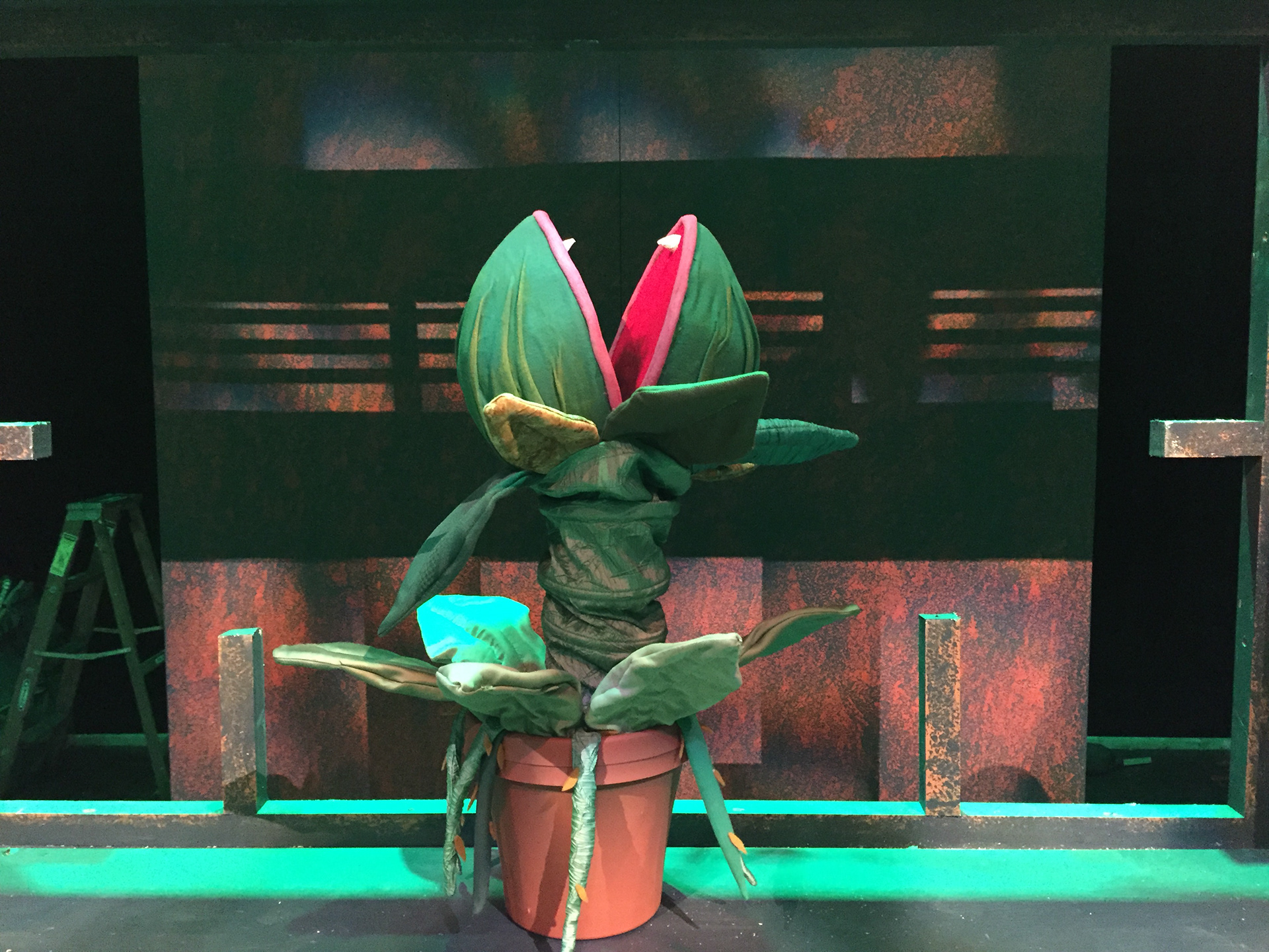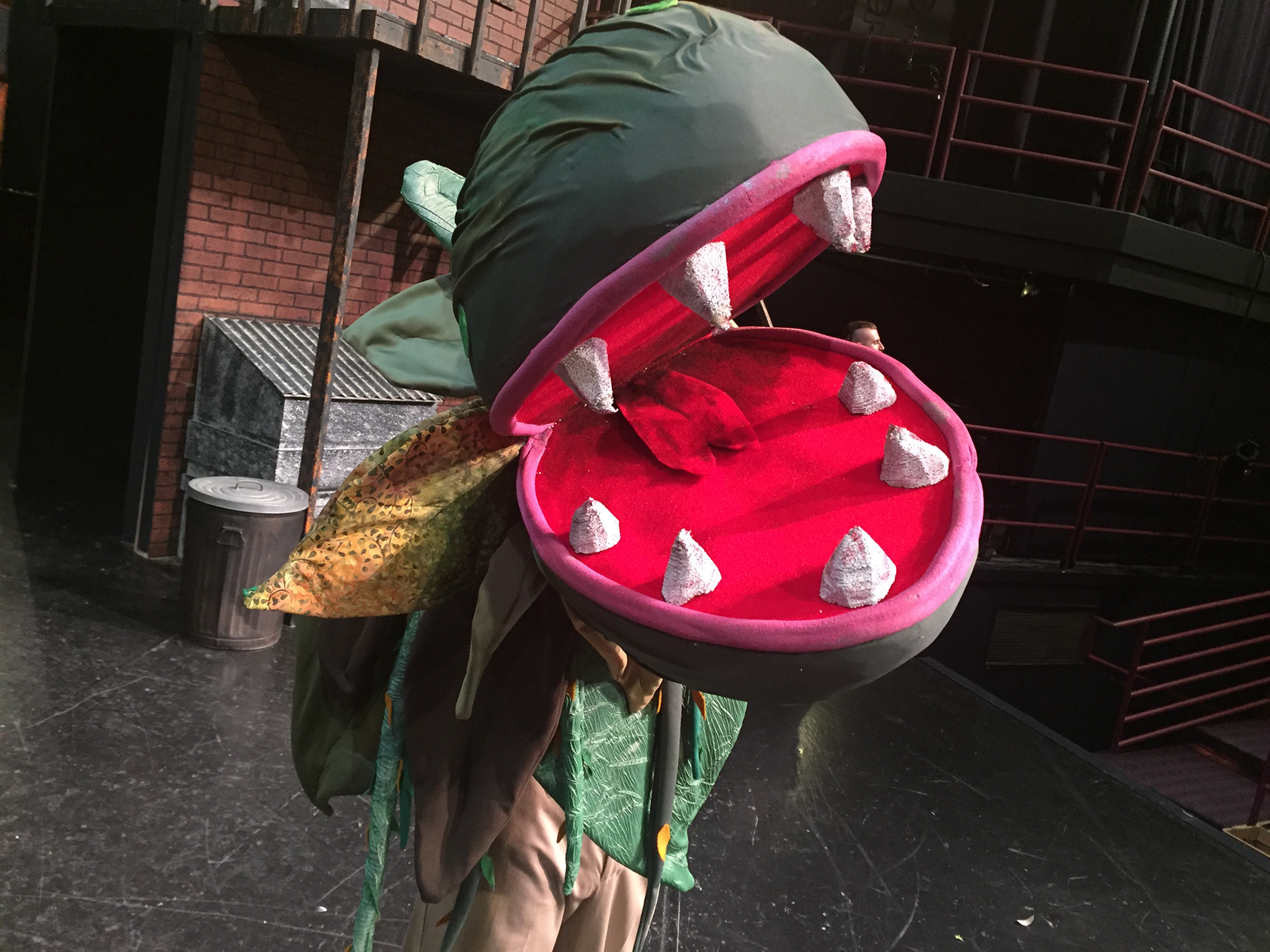 The smallest one was rigged with springs and wire for the leaves on the pot to wilt when needed to on stage. The medium sized one was fitted with a bike glove that would strap down on the actor's hand (played by Zach Fluegel) so he had firm control over the puppet due to it's weight.