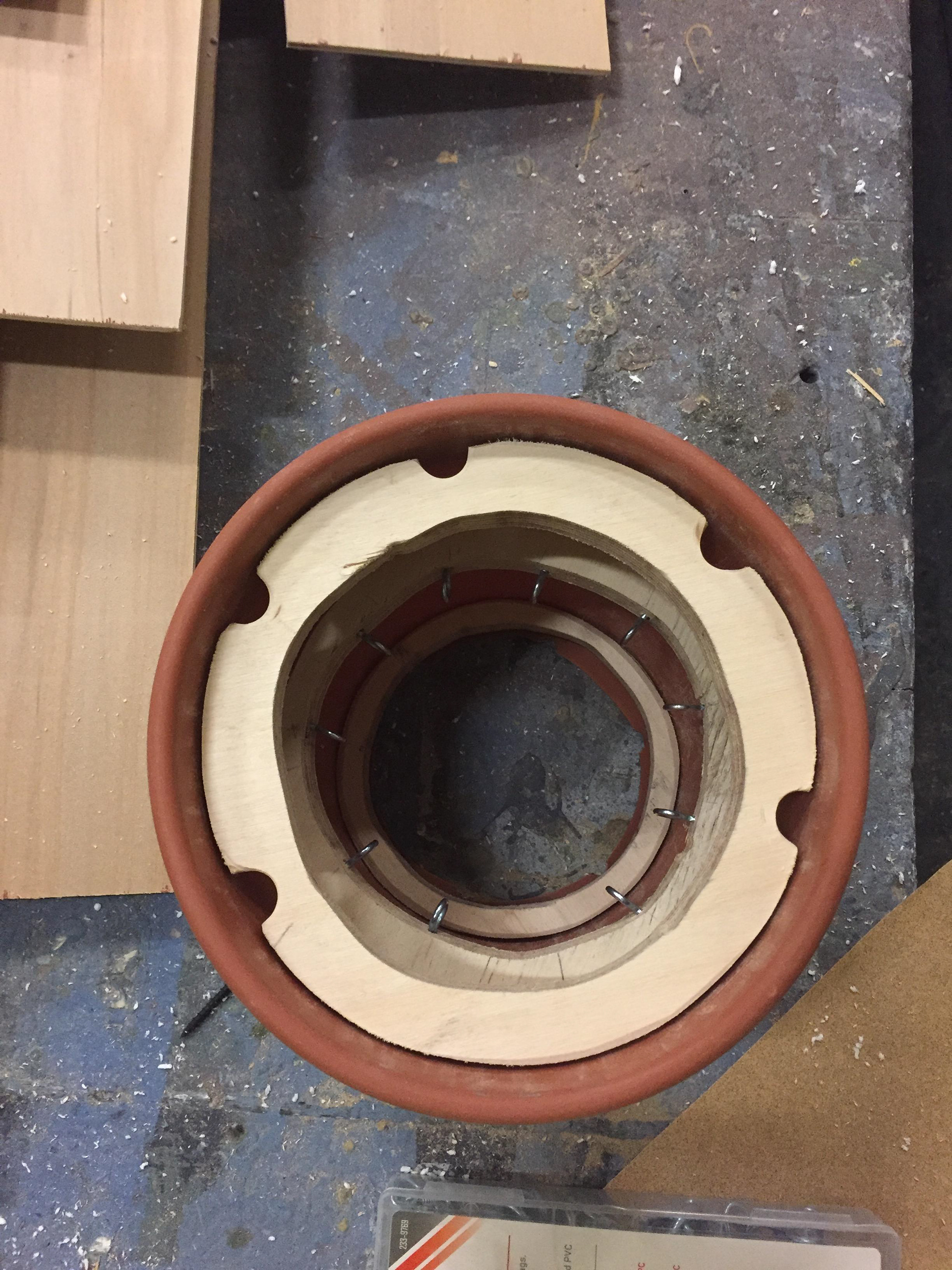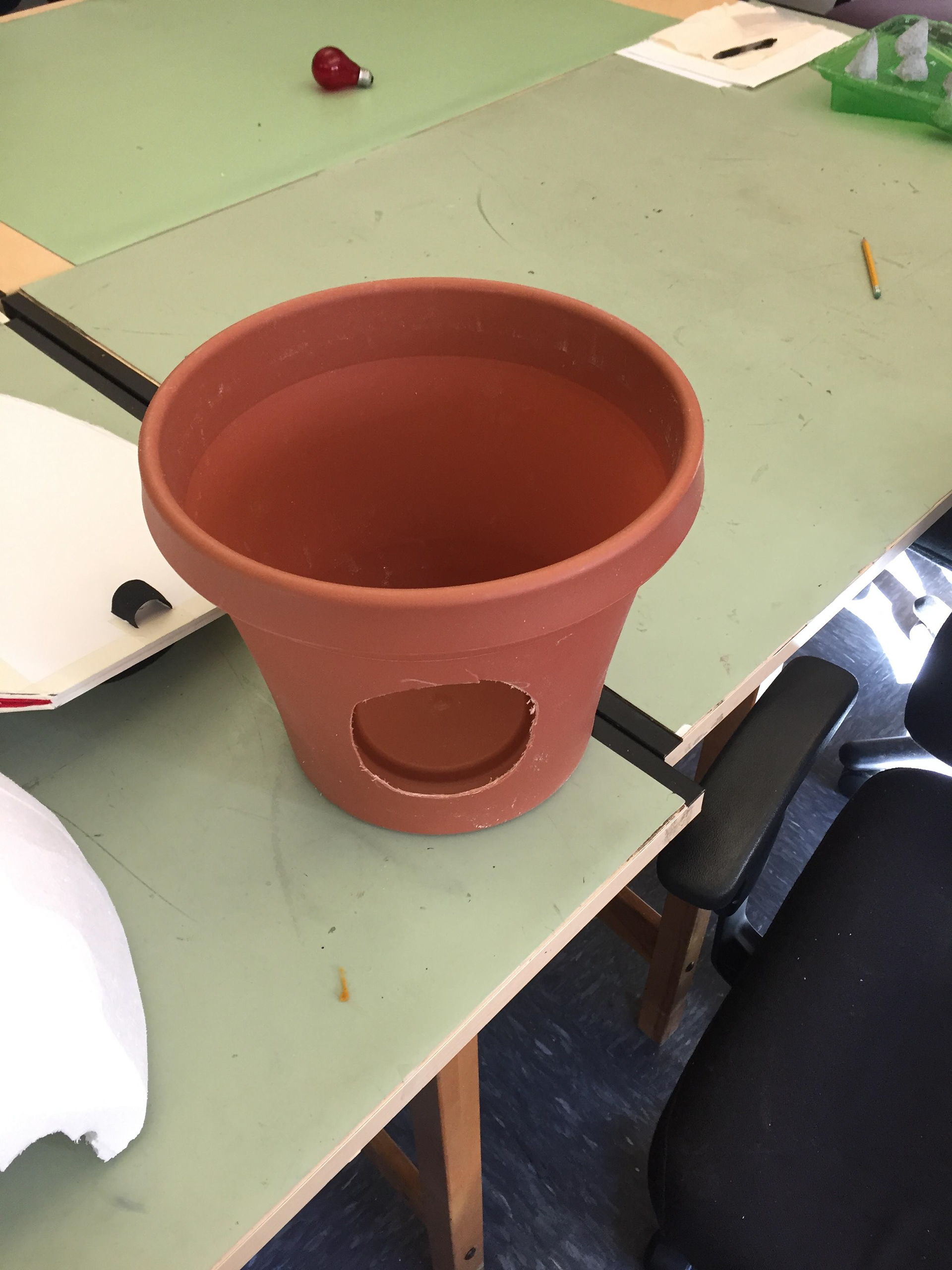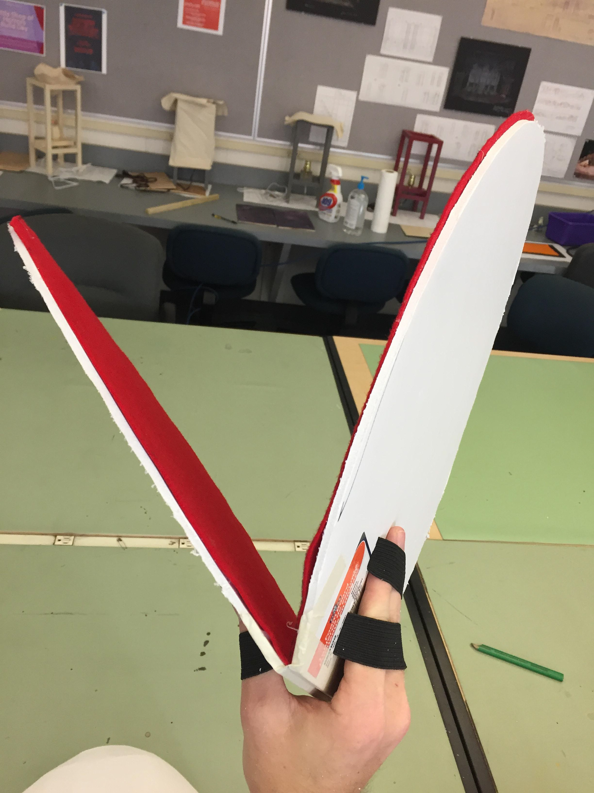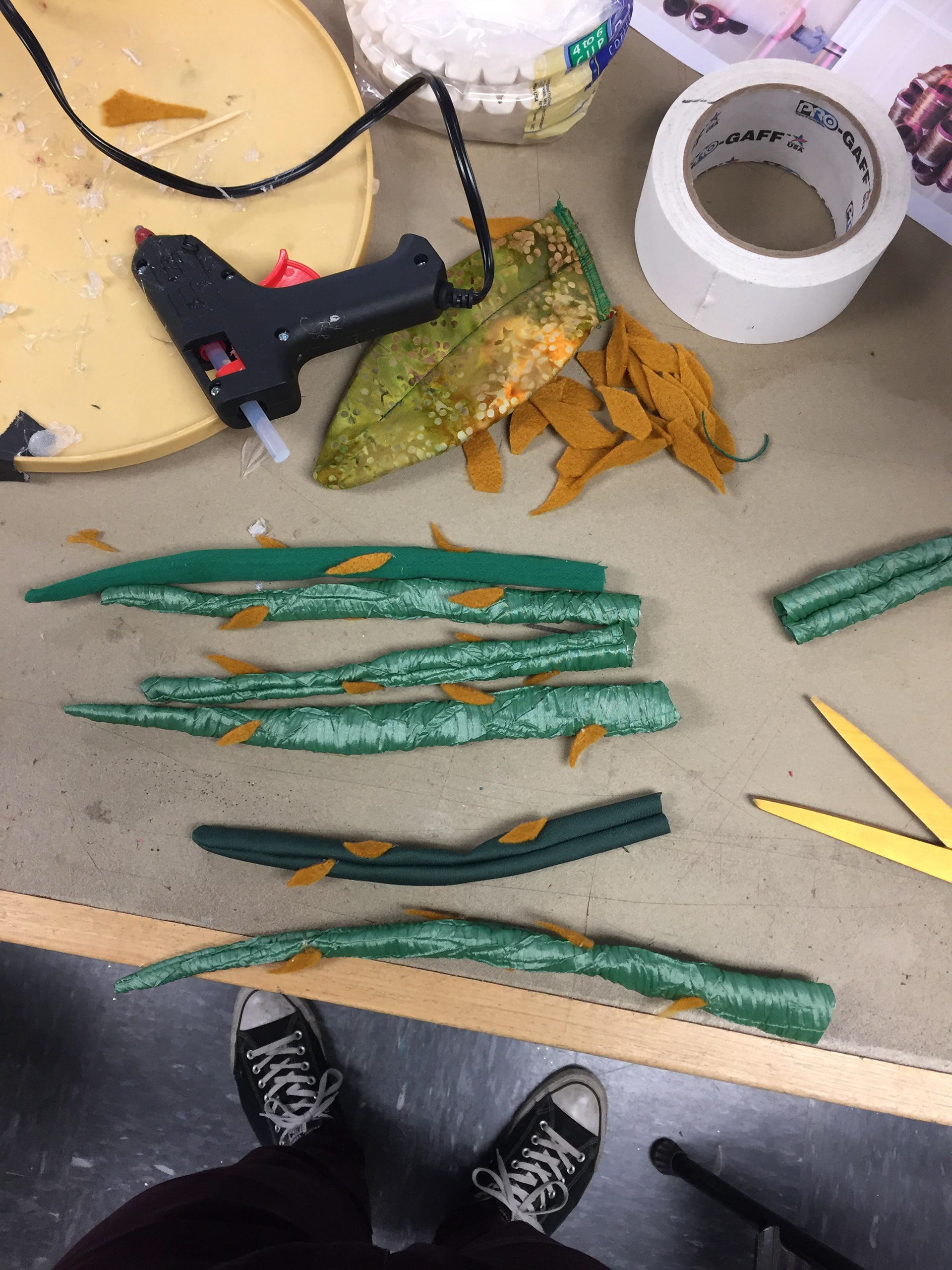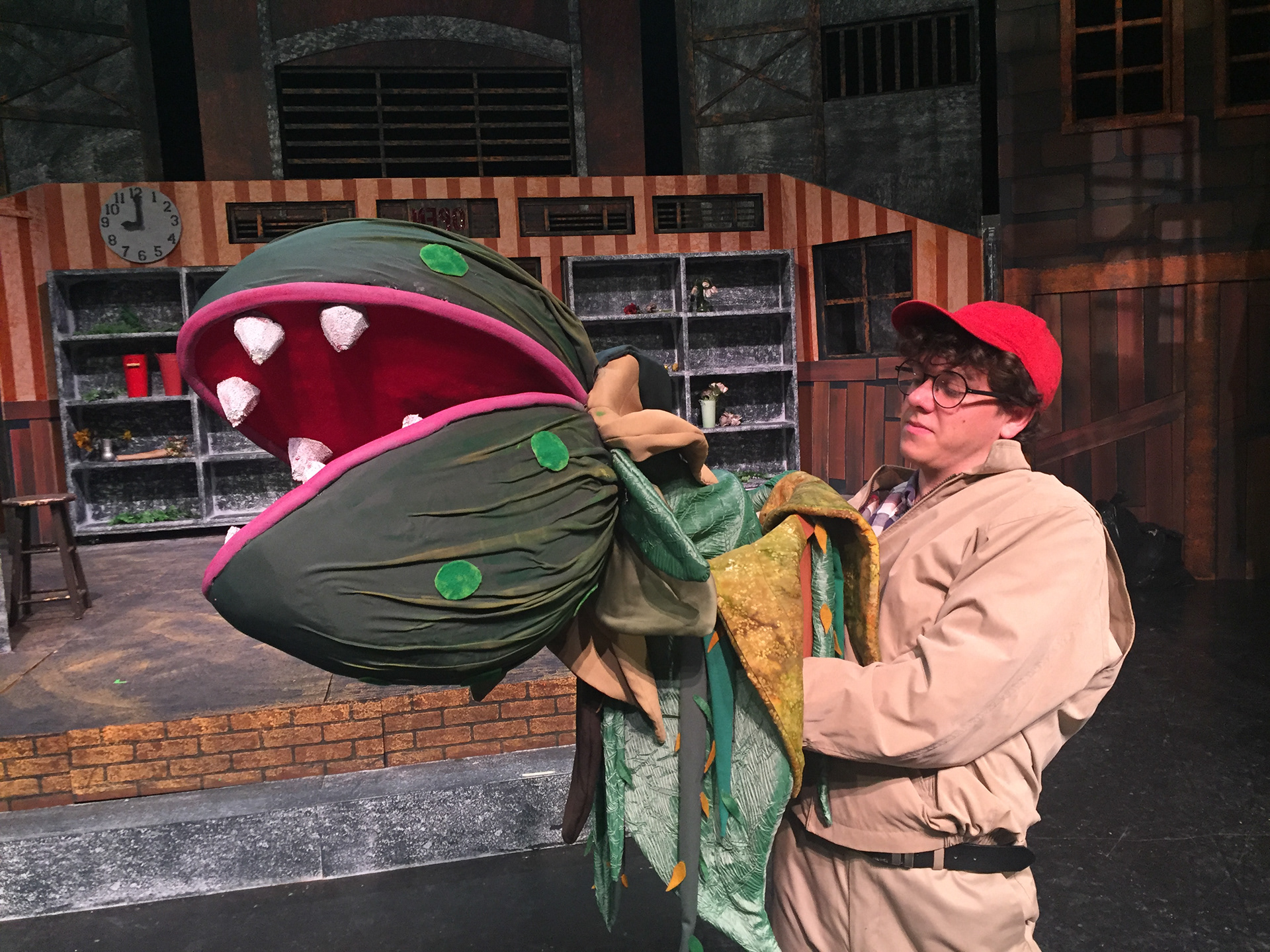 The smallest one was rigged with springs and wire for the leaves on the pot to wilt when needed to on stage. The medium sized one was fitted with a bike glove that would strap down on the actor's hand (played by Zach Fluegel) so he had firm control over the puppet due to it's weight.
